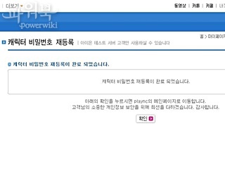 원하는 비밀번호를 설정 후 확인 버튼을 누르시면 캐릭터 비밀번호가 정상적으로 등록된다.