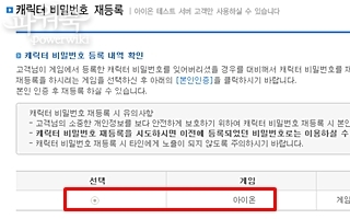 반드시 본인인증 절차를 거쳐야만 캐릭터 비밀번호를 재설정할 수 있는 페이지로 전환된다.