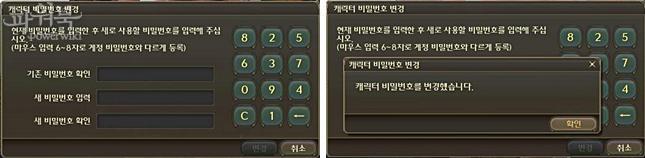 캐릭터 비밀번호의 변경은 게임 내 접속 후 캐릭터 선택 시 팝업 되는 비밀번호 입력창의 좌측 하단 [캐릭터 비밀번호 변경] 버튼 선택을 통해 가능하다.