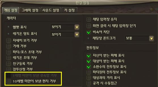- 해당 옵션을 설정한 캐릭터에게 10레벨 미만의 캐릭터가 편지를 보낼 경우 ‘XXX님이 10레벨 미만이 보내는 편지를 거부한 상태입니다.’ 라는 안내 메시지가 출력됩니다.