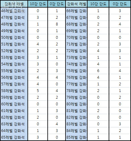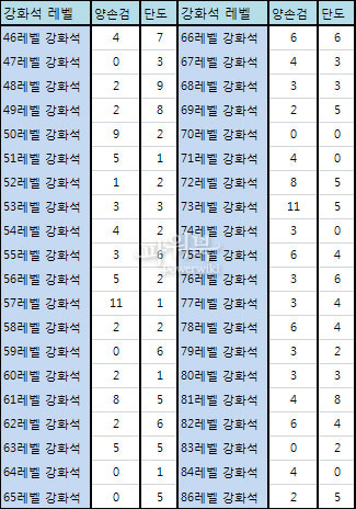 양손검에서 얻은 강화석의 레벨 분포는 46레벨~ 86레벨 사이로 단도를 추출해 얻은 강화석의 레벨 분포과 일치했다.