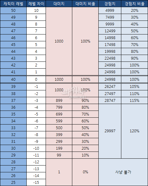 파워 QnA에서는 실험을 통해서 레벨 차이에 따른 대미지 페널티와 경험치 획득량 변화를 확인해보도록 하겠다.