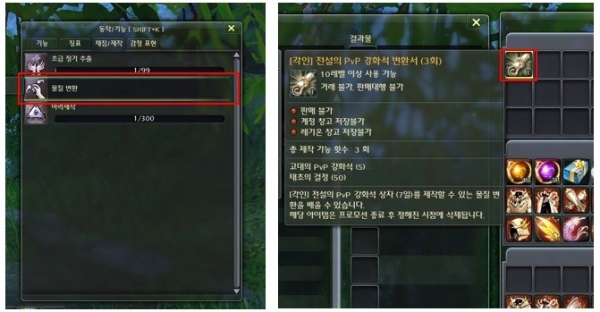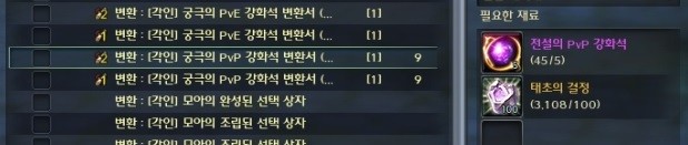 4. '[각인] 전설의 PVE/PVP 강화석 변환서'는 3회 제작 후, '[각인] 궁극의 PVE/PVP 강화석 변환서'는 1회 제작 후