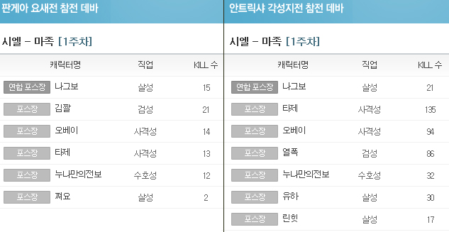 P.s 이번 주 판게아 요새전에서 시엘-마족의 승리를 이끈 주역들! 포스장 정보를 투척합니다! 각 진영 별 자세한 판게아 전투 정보는 ‘판게아 2015’ 페이지에서 직접 확인하실 수 있습니다.
