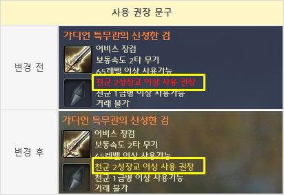 1. 장비 아이템을 계급 제한으로 착용할 수 없는 경우 표시되는 사용 권장 문구의 색상을 변경하였습니다.