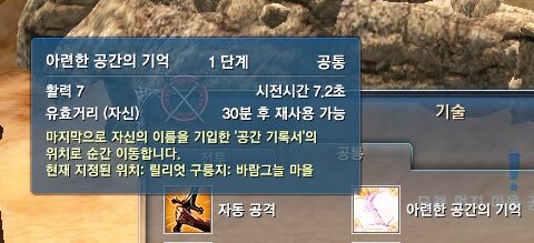 [시전 쿨타임은 30분. 귀환스킬을 쓰면 지정된 위치로 이동이 가능하다.]