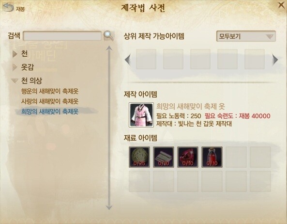 희망의 새해맞이 축제 옷 : 무지개빛 야타실(25) 구름결 옷감(10) 루비(10) 선홍빛 장미 염료(10)