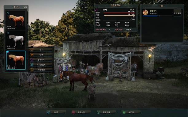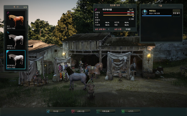 이곳에선 말의 정보와 성별 , 스킬을 보고 말을 구입할 수 있습니다.