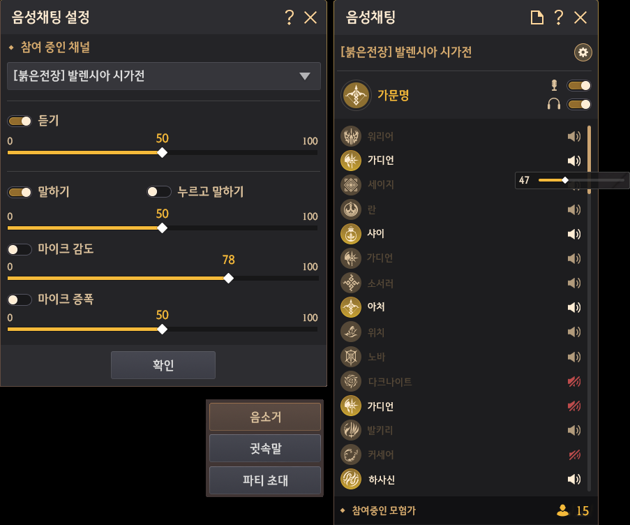 - 음성 채팅 UI의 톱니바퀴 버튼을 통해 채널을 변경(길드 / 붉은 전장 - 발렌시아 시가전)하거나 듣기, 말하기와 관련된 세부 설정을 할 수 있습니다.