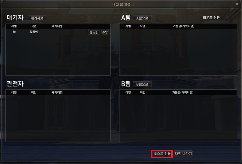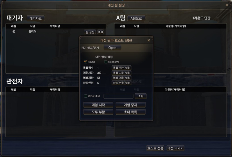 - Round 모드는 A팀과 B팀의 대결로 전투가 진행되는 모드입니다. 초대되어 대기자 목록에 표시된 인원을 호스트가 임의로 A팀, B팀으로 나눌 수 있습니다.
