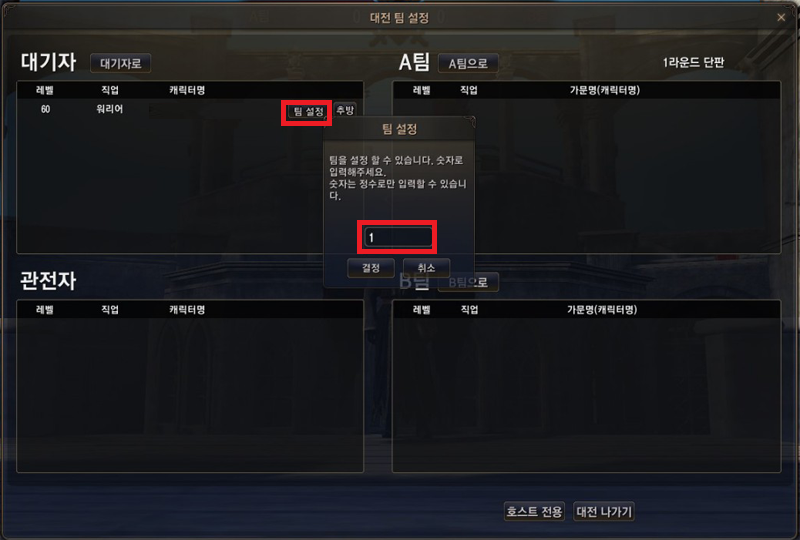 ▲ 원하는 인원의 팀 설정 버튼을 클릭하여 숫자 1 또는 2를 입력하면 A팀 또는 B팀으로 팀이 설정됩니다.
