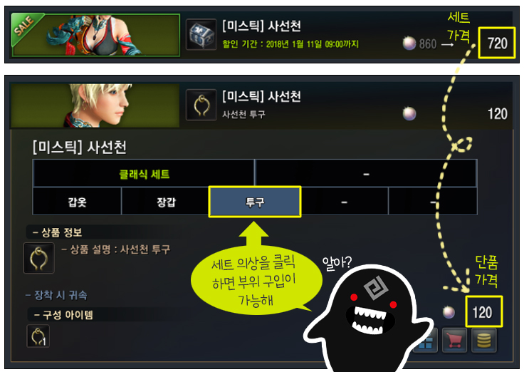 더불어 현재에는 펄 의상 세트 중 무기를 제외한 부위만을 단품으로 구매할 수 있지만