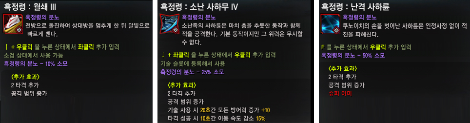 각 기술은 흑정령의 분노가 10%, 25%, 50% 쌓인 상태에서 상황에 따라 "F", "LB", "RB" 등 추가 키입력으로 사용할 수 있으며, 보다 역동적인 조작이 가능한 것이 특징입니다.