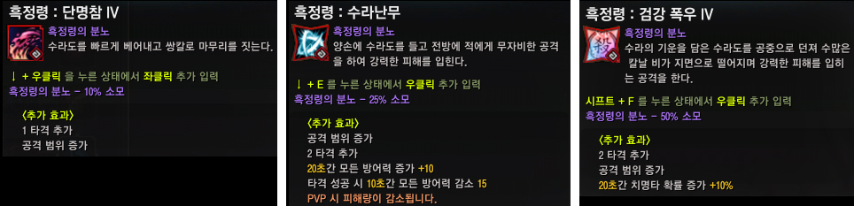 ● 단명참, 수라난무, 살 : 검강폭우 기술에 흑정령 분노 기술이 확장되었습니다.