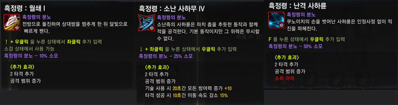 - 각 기술은 흑정령의 분노가 10%, 25%, 50% 쌓인 상태에서상황에 따라 "F" ,"LB", "RB"등 추가키 입력으로 사용할 수 있으며, 보다 역동적인 조작이 가능한 것이 특징입니다.