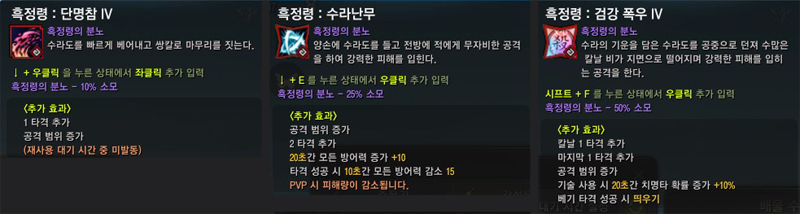 ● 흑정령의 분노를 단명참, 수라난무, 살 : 검강폭우 기술에도 사용할 수 있도록 확장되었습니다.
