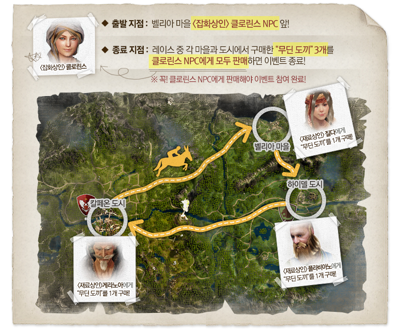 1. 이벤트 시작 전까지 벨리아 마을 잡화상인 클로린스 NPC 앞으로 이동해 주세요.