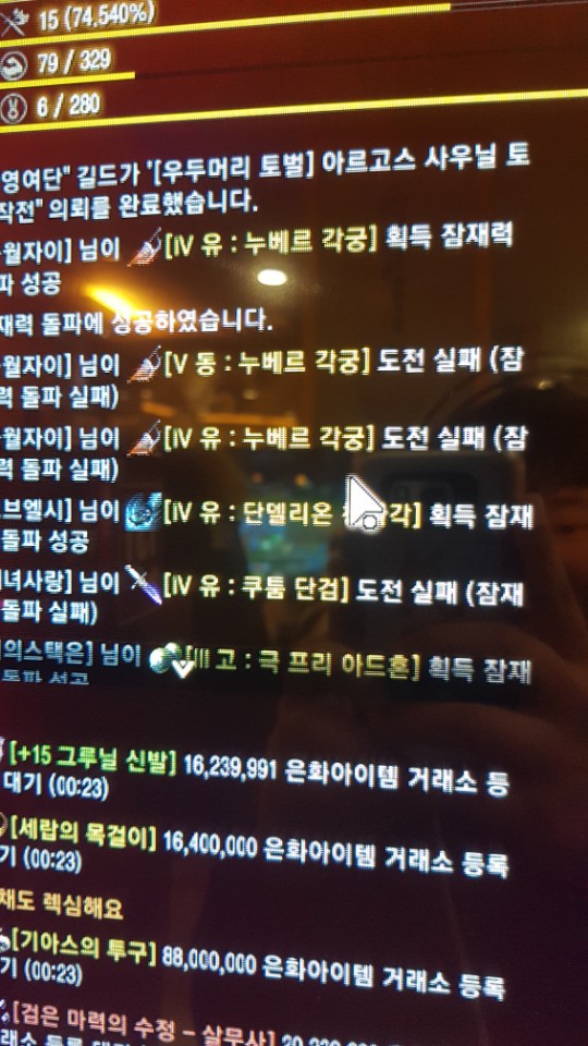 잠시 멍해지어 뭐야~ 라는 소리와 함께 머리가 하얗게 되어 벙진 말투로 사태를 어버버하면서 채팅창에 올라온 강화로그를 사진찍었습니다.