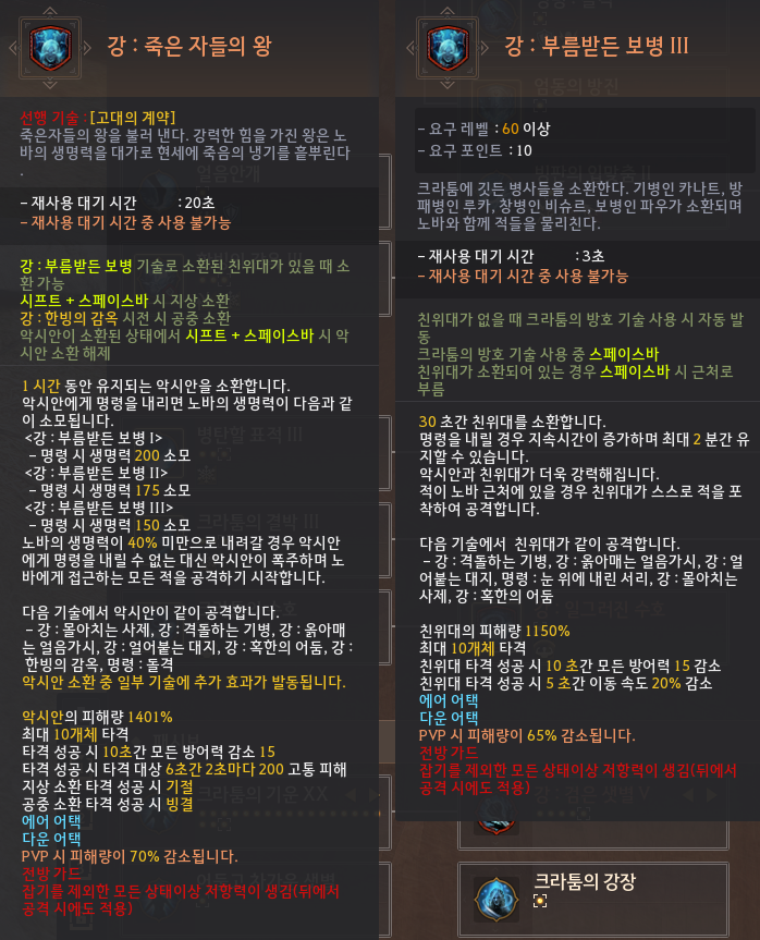" 크라툼의 상승 " , " 덮치는고리 " 스킬 사용시 친위대가 같이 나와 타격을 해야 정상이고