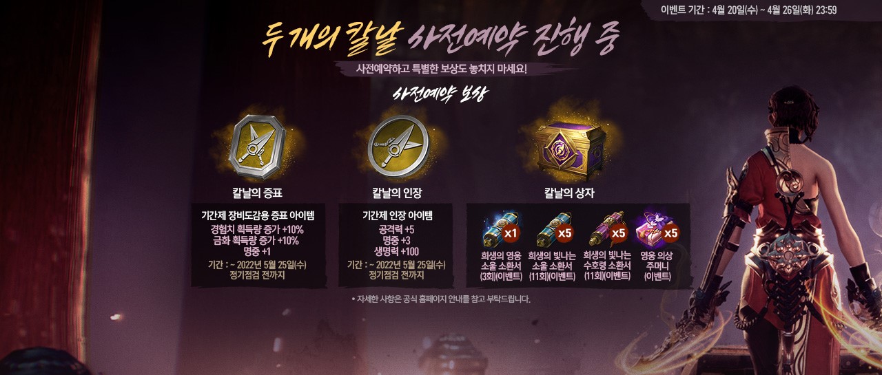 - [두 개의 칼날] 사전예약 쿠폰은 2022년 4월 27일(수) 08:00 ~ 2022년 5월 25일(수) 정기점검 전까지 등록하실 수 있습니다.