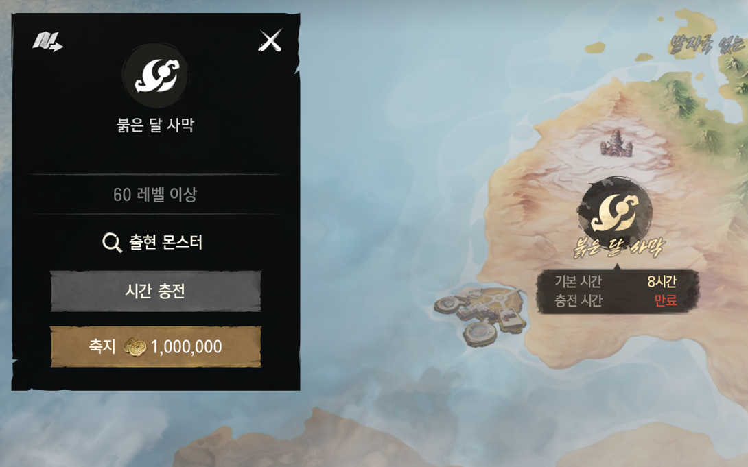 - 월드 필드는 태록림 지역 지도 왼쪽 아래에 있는 붉은 달 사막 입장 창으로 입장할 수 있습니다.