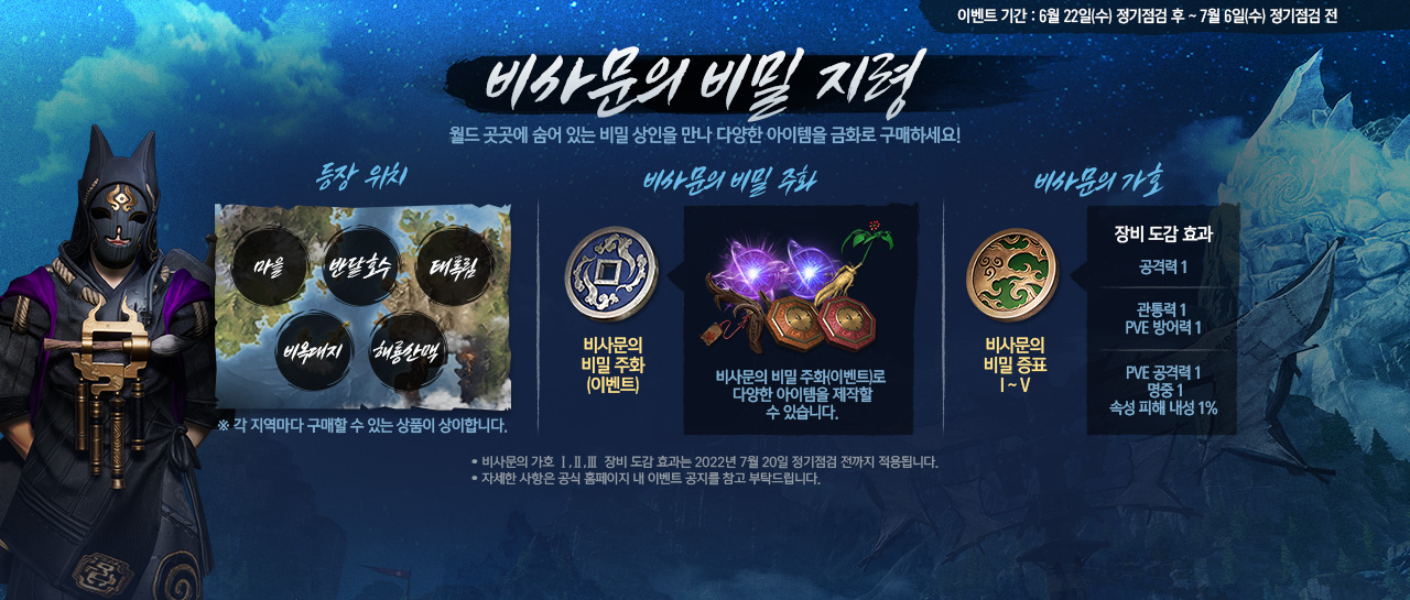 - 주요 마을과 사냥터에서 비사문 비밀 상인이 등장합니다.
