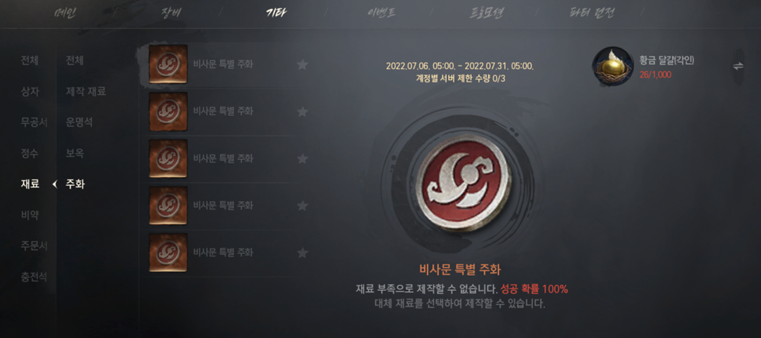 현재 비사문 특별 주화의 제작 가능 기간이 2022.07.31까지로 되어 있어서, 이후 제작이 불가능한 것으로 오해하시는 분들이 계시는 것으로 확인했습니다. 해당 제작은 매월 1일 제작 가능 수량이 초기화되는 제작으로, 해당 기간이 지난 이후에도 제작이 가능하다는 점을 안내 드립니다.