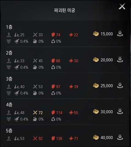 난이도별 필요 레벨 및 요구 능력치는 아래와 같습니다.