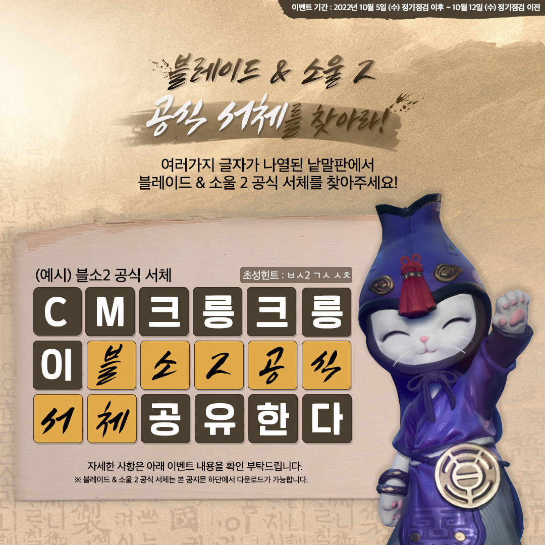 <깜짝 주관식> 블레이드 & 소울 2 공식 서체는 붓글씨가 너무 매력적이다냥. 다음에는 블소2 공식 서체를 활용해 이벤트에 참여할 거다냥! |