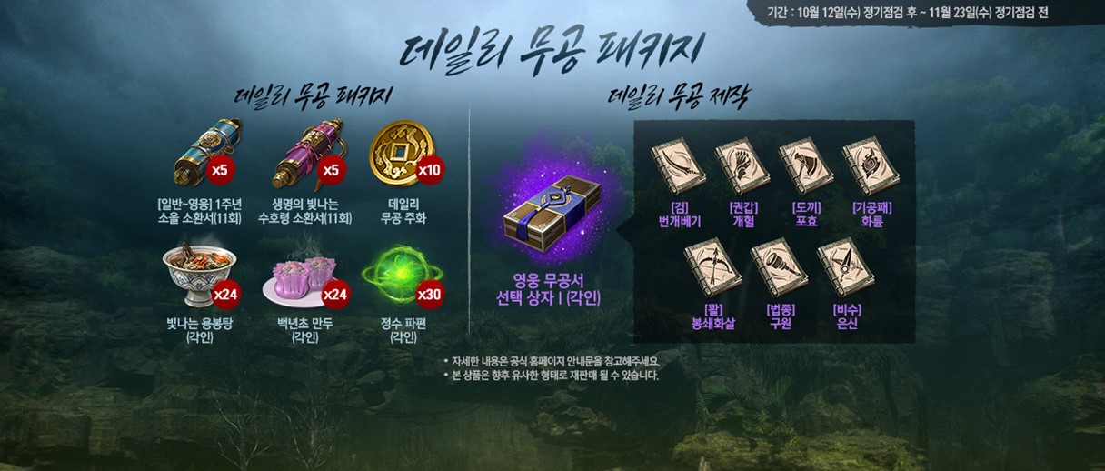 데일리 무공 패키지 | 11,000원 | 빛나는 용봉탕(각인) | 24 | X / X / X | 계정당 매일 1회 |