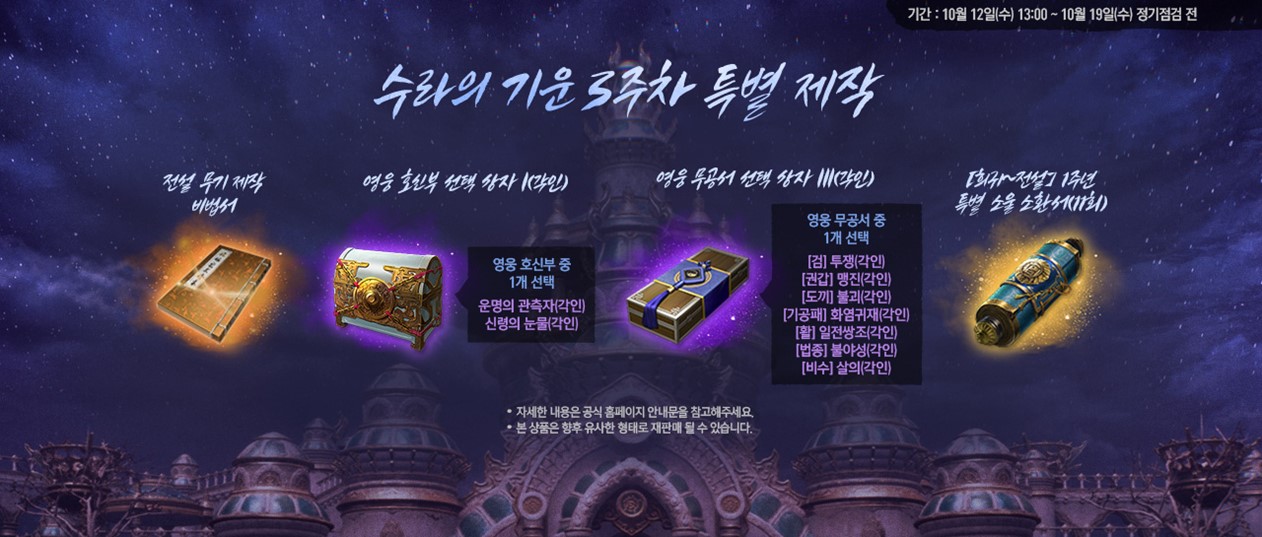 [영웅] 1주년 소울 파편(7개) 선택 꾸러미 | 수라의 기운 | 120 | 100.00% | - | - | 계정별 서버당 2회 |