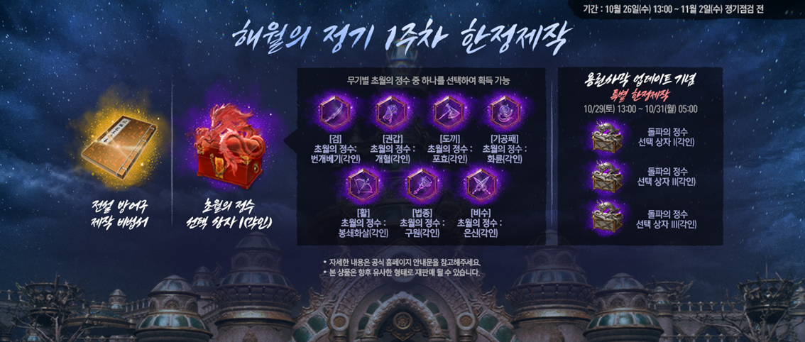 돌파의 정수 선택 상자 I(각인) | 해월의 정기 | 130 | 10.00% | 서버 당 2개 |