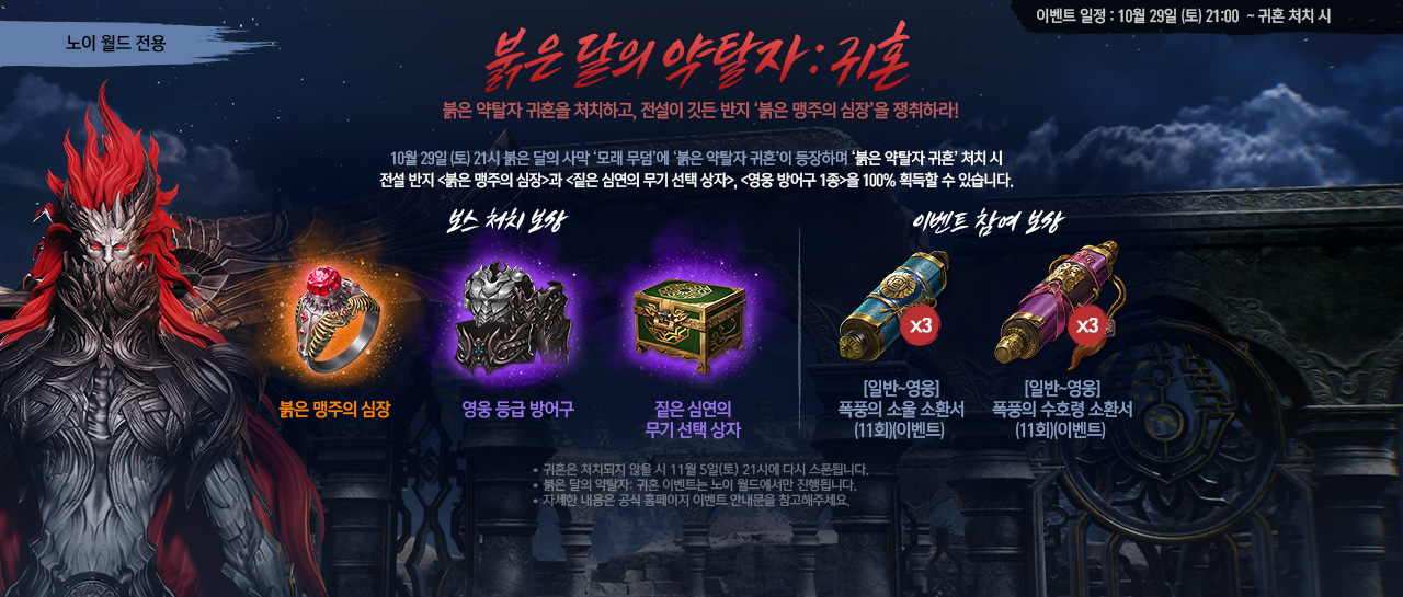 - ‘붉은 달의 약탈자: 귀혼’ 이벤트는 한시적으로 진행되는 이벤트이며, 추후 다른 방식으로 이벤트가 진행될 수 있습니다.