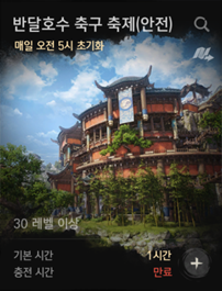 <반달호수 축구 축제>는 30레벨 이상부터 입장 가능하며 하루 1시간 이용할 수 있습니다.