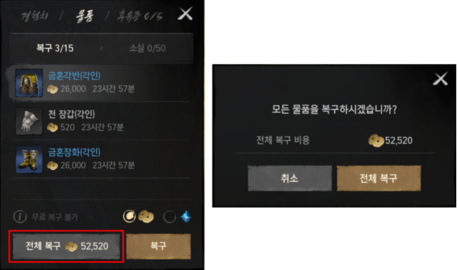 - 손실된 물품을 전체 복구한 경우 장착했던 장비가 자동 장착되지 않는 현상이 있습니다. 소지품창에서 직접 장착 진행이 필요합니다.