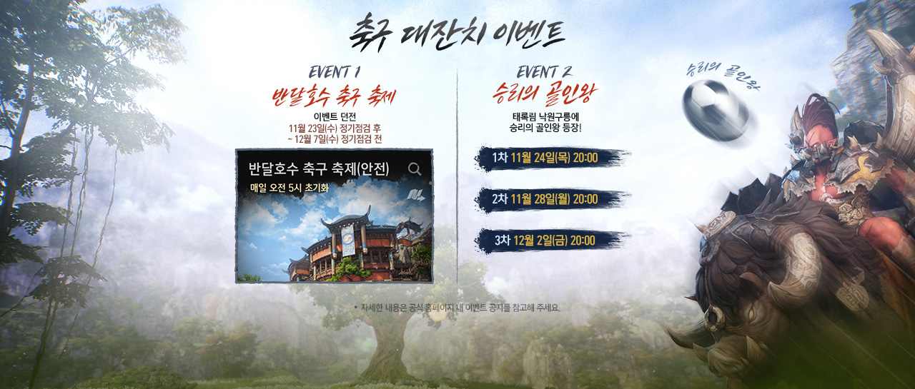 - 이벤트 기간 동안(11/23(수) 정기점검 후 ~ 12/7(수) 정기점검 전) '승리의 골인왕' 보스 몬스터가 등장하는 지역은 일반 지대에서 안전 지대(PVP 불가)로 변경됩니다.
