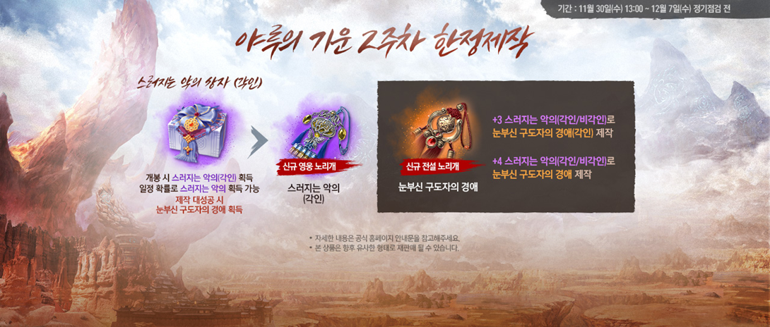 - 판매 기간 중 야루의 기운을 활용하여 제작 가능한 아이템 리스트 및 수량은 변동될 수 있습니다.