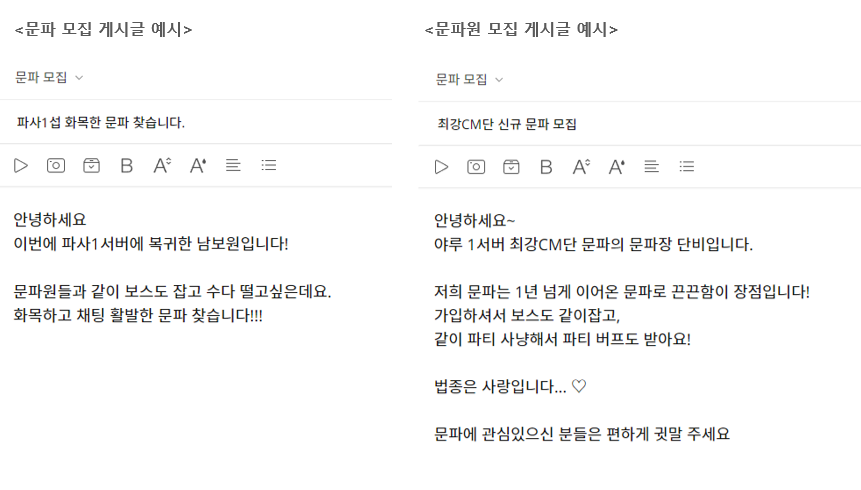 - 정착할 문파를 찾으시는 분은 문파 모집 게시글, 신규 문파원을 모집하시는 기존 문파는 문파원 모집(문파 홍보) 게시글을 자유 양식으로 작성해주세요.