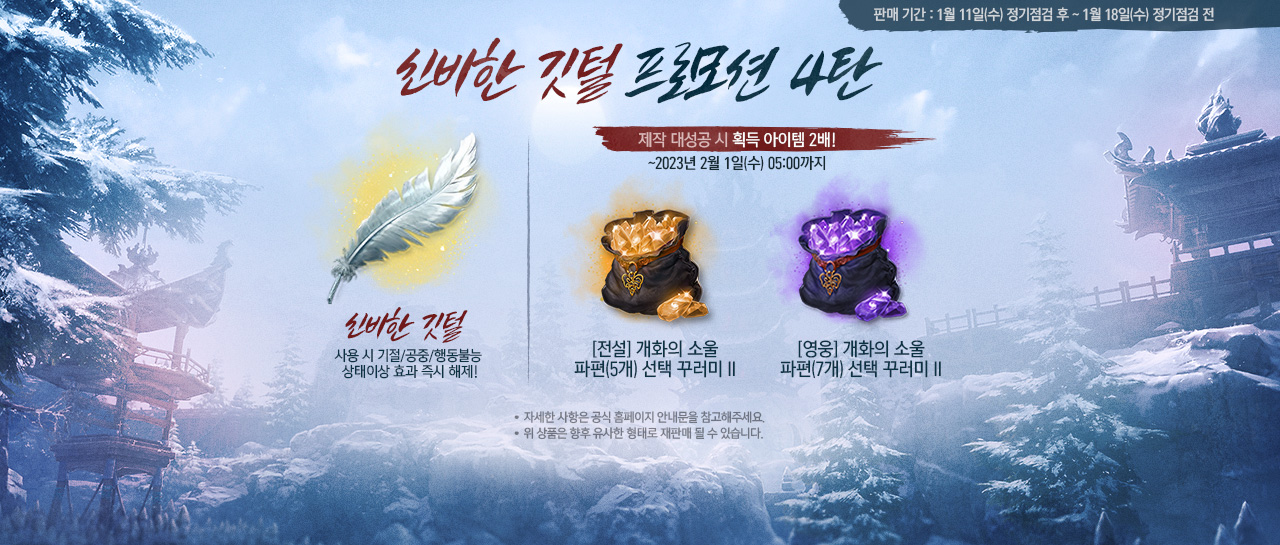 - 상품 판매 기간: 2023년 1월 11일(수) 정기점검 후 ~ 2023년 2월 1일(수) 정기점검 전