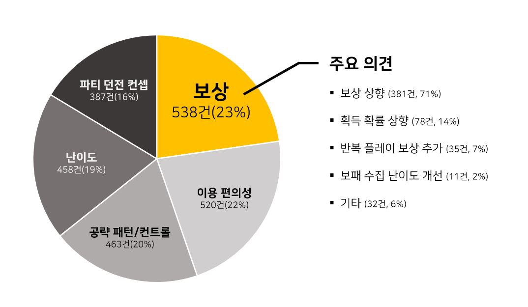 이 중 던전 보상에 관한 의견이 538건(23%)으로 가장 높은 비중을 차지 하였으며,