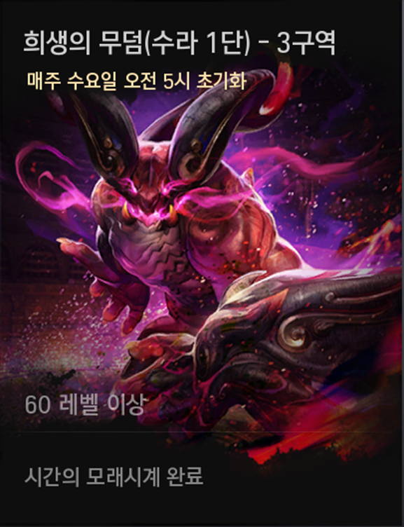 희생의 무덤(수라 1단) 1구역 | 불마의 선봉장(각인) 불마의 분노(각인) | 암천의 기운(각인) |