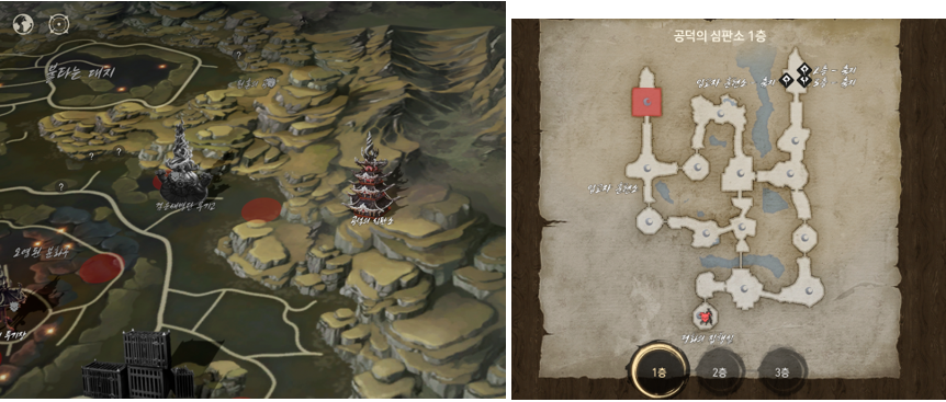 - 공덕의 심판소는 던전메뉴 - ‘월드 던전’ 탭을 통하거나 해룡산맥 맵의 ‘공덕의 심판소’ 아이콘을 통해서 1층으로 이동이 가능합니다.