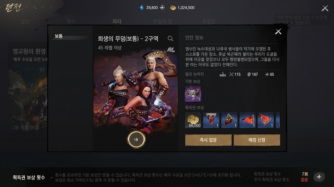 보상 획득권: 파티 던전(이벤트) | 3 | 12 | 계정당 주간 1회 | 3.50000% |