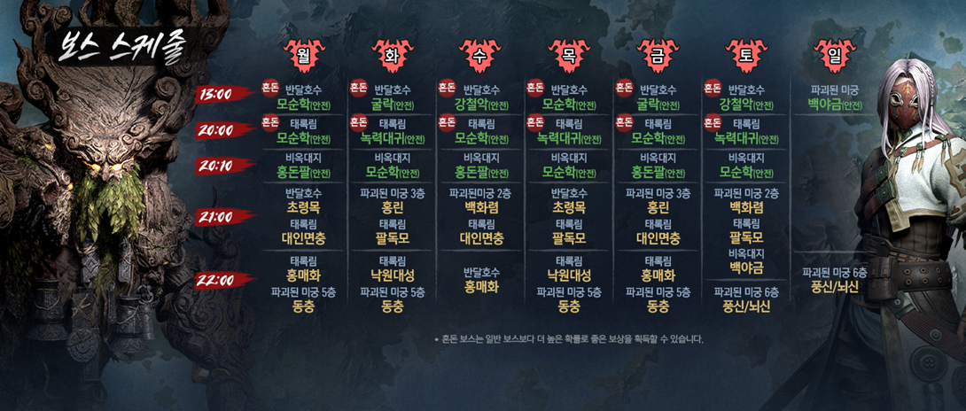 - 보스가 나타나는 시간은 아래 스케줄표를 참고하세요.