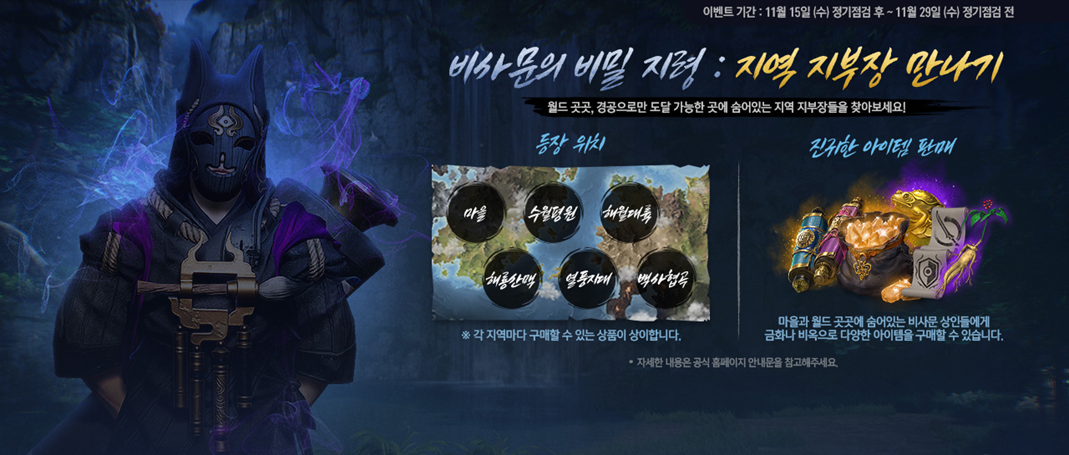 - 주요 마을과 사냥터에서 비사문 지역 지부장이 등장합니다.