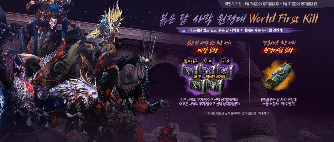 이벤트 | 붉은 달 사막 원정대 : World First Kill | 2024. 1. 24. ~ 2024. 1. 31. | |