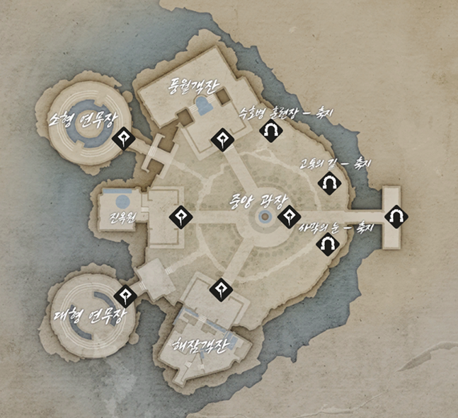 수호병 훈련장 – 축지 | 용린항에서 수호병 유적지에 있는 수호병 훈련장 사냥터로 이동할 수 있습니다. |