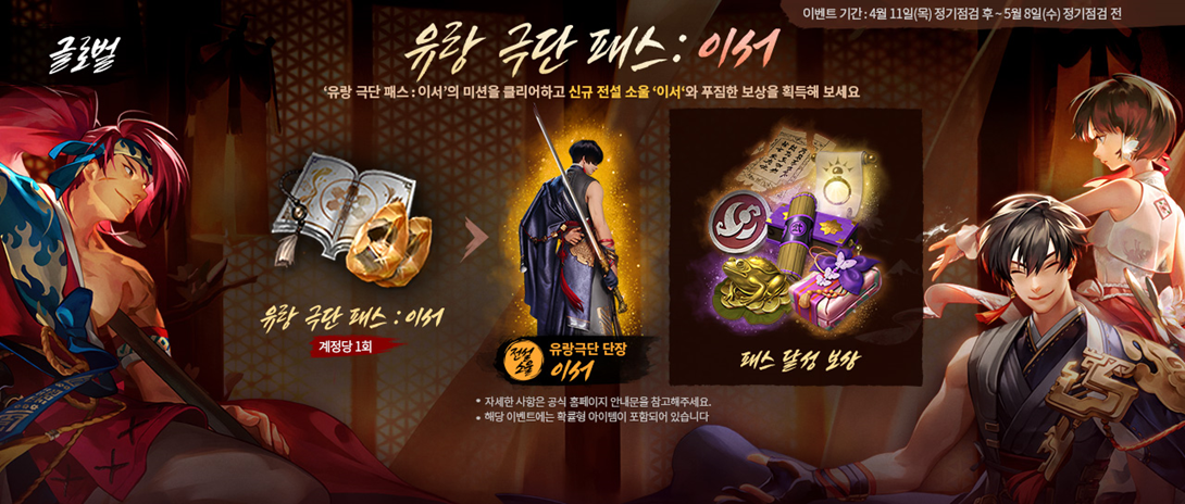 - 상점에서 <유랑극단 패스 : 이서>상품 구매 시 추가 보상을 획득할 수 있습니다.
