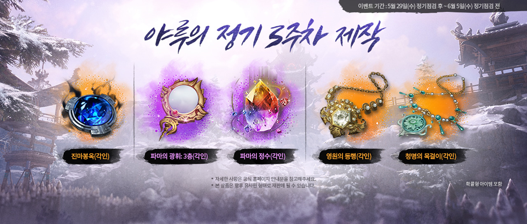 - 판매 기간 중 야루의 정기를 활용하여 제작 가능한 아이템 리스트 및 수량은 변동될 수 있습니다.