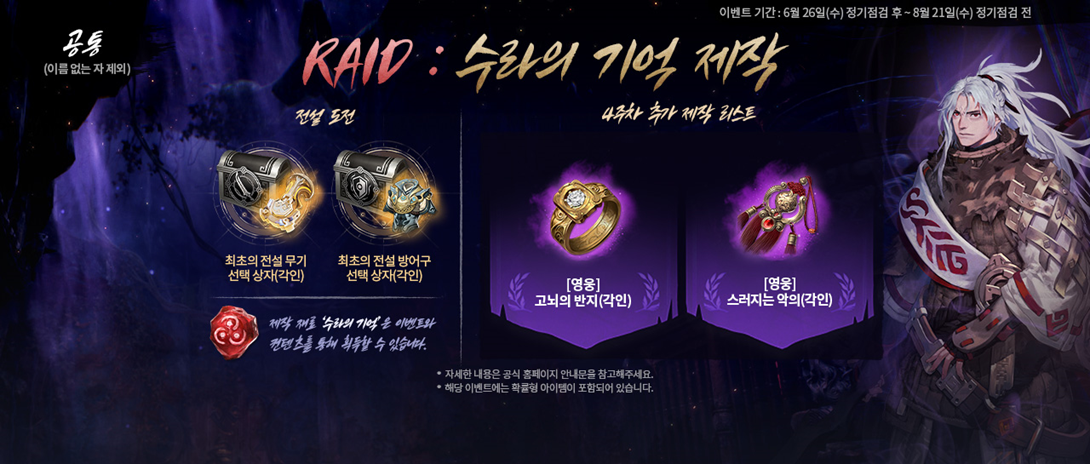 [이벤트] RAID : 수라의 기억 4주차 (공통) | 2024.06.26. ~ 2024.08.21 | |